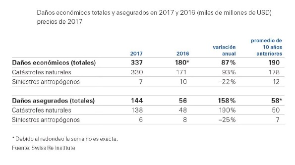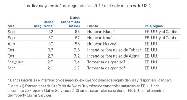 En concreto, según indica el último informe sigma de Swiss Re Institute, estos tres huracanes produjeron unos daños asegurados combinados de 92.000 millones de dólares (74.822 millones de euros), convirtiendo la temporada de huracanes del Atlántico Norte de 2017 en la segunda más costosa desde 2005. En cuanto a los grandes incendios forestales en todo el mundo causaron unos daños asegurados combinados de 14.000 millones de dólares, los mayores jamás registrados.