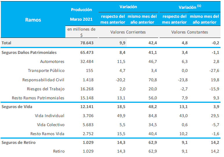 La Estimación de la Producción del Mercado Asegurador, correspondiente al mes de marzo de 2021 elaborada por la SSN indica que la misma se redujo 0,2% a valores constantes en relación al mismo mes de 2020. Respecto a febrero, la producción total creció 4,8%. Los ramos que más crecieron -comparando marzo 2020 y marzo 2021- son Vida Individual (29,5%), RC (19,8%) y Retiro (14,2%). Entre febrero y marzo de este año, la producción de Automotores creció 6,3%, Retiro 9,1%, y la Vida Individual 43%, siempre a valores constantes.