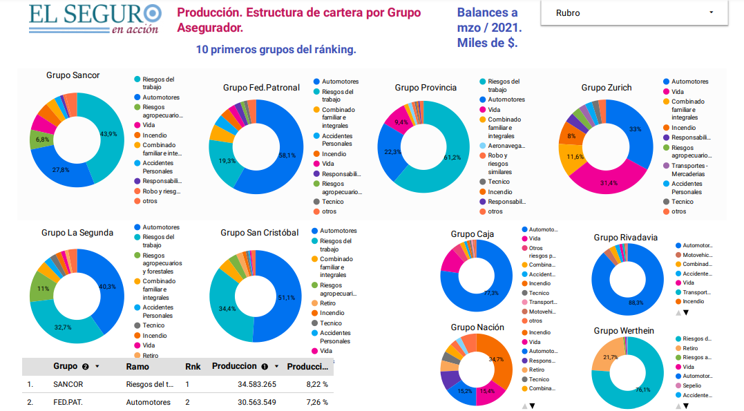 En ediciones pasadas observamos la concentración del mercado, estructurando el análisis en función de la producción de los 10 primeros Grupos Aseguradores, de acuerdo a su facturación. Ahora, analizamos la estructura de cartera de esos mismos 10 grupos empresarios, considerando los primeros 9 meses de producción de primas en el ejercicio económico 2020-2021 (hasta el 31 de marzo pasado). En los gráficos que siguen a continuación se observa cuanto contribuye cada ramo a la producción total del GRUPO (consideramos el grupo en su totalidad, no cada empresa por separado). De…