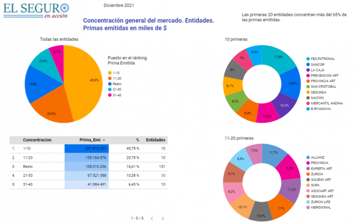 Aquí puede observarse que las 10 primeras entidades concentran el 46% del total de la prima, mientras que el segundo lote (puestos 11 al 20) tienen menos de la mitad que los primeros (21%).