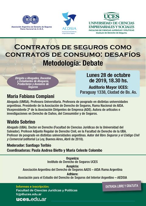 Debate: Contratos de seguros como contratos de consumo: desafíos 17 octubre, 201916 enero, 2020 El Seguro en Acción La Dra. María Fabiana Compiani y el Dr. Waldo Sobrino presentarán este interesante debate el próximo lunes 28 de octubre a las 18,30 hs en el auditorio de la UCES: Paraguay 1338, CABA.